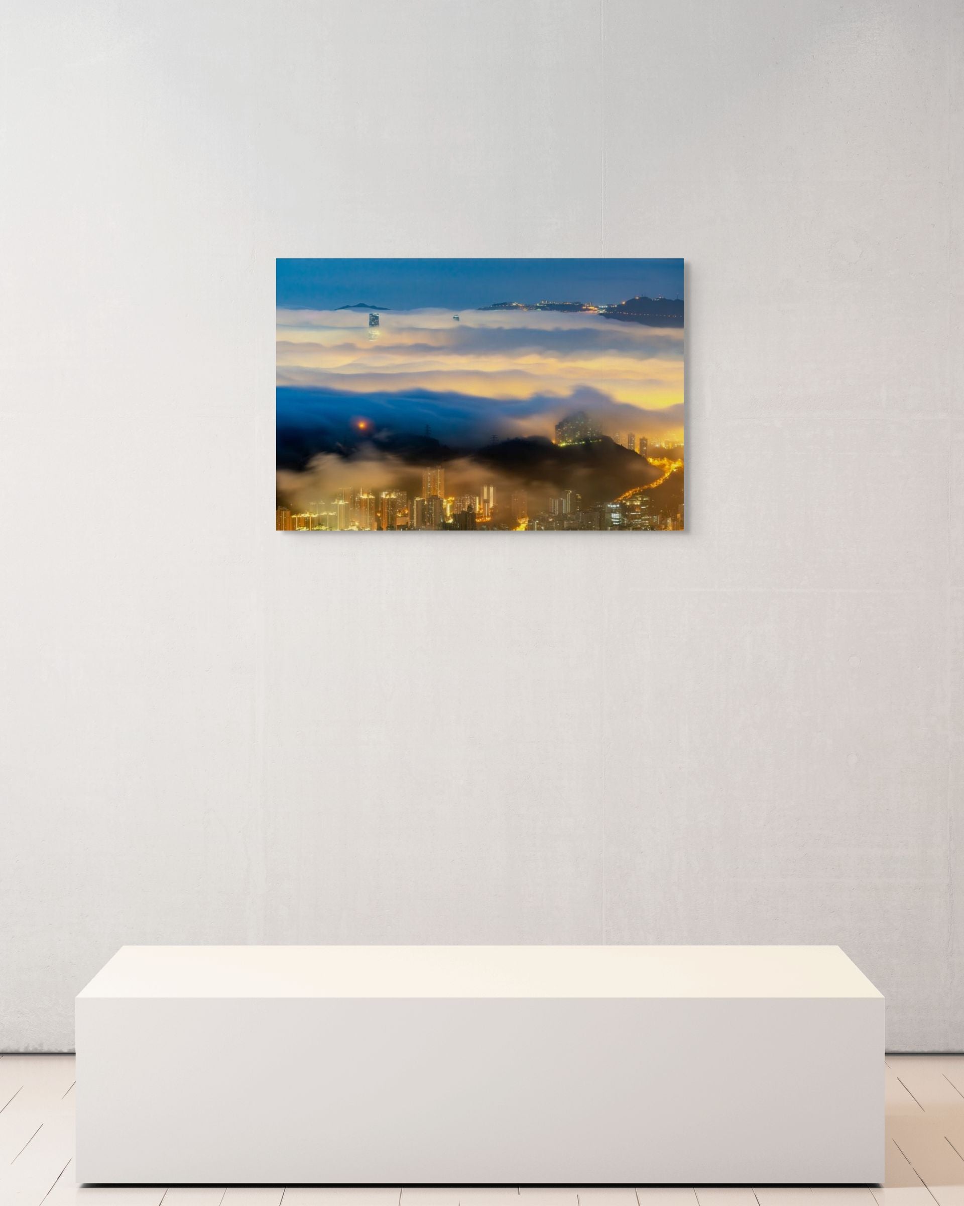 A City Submerged - From the highest peak in Hong Kong, the city lies under a soft tide of cloud. A few skyscrapers rise above the surface, while buildings nearer the mountain fade gently into the shroud. The light drifts between night and day, blending city glow with the first trace of dawn.