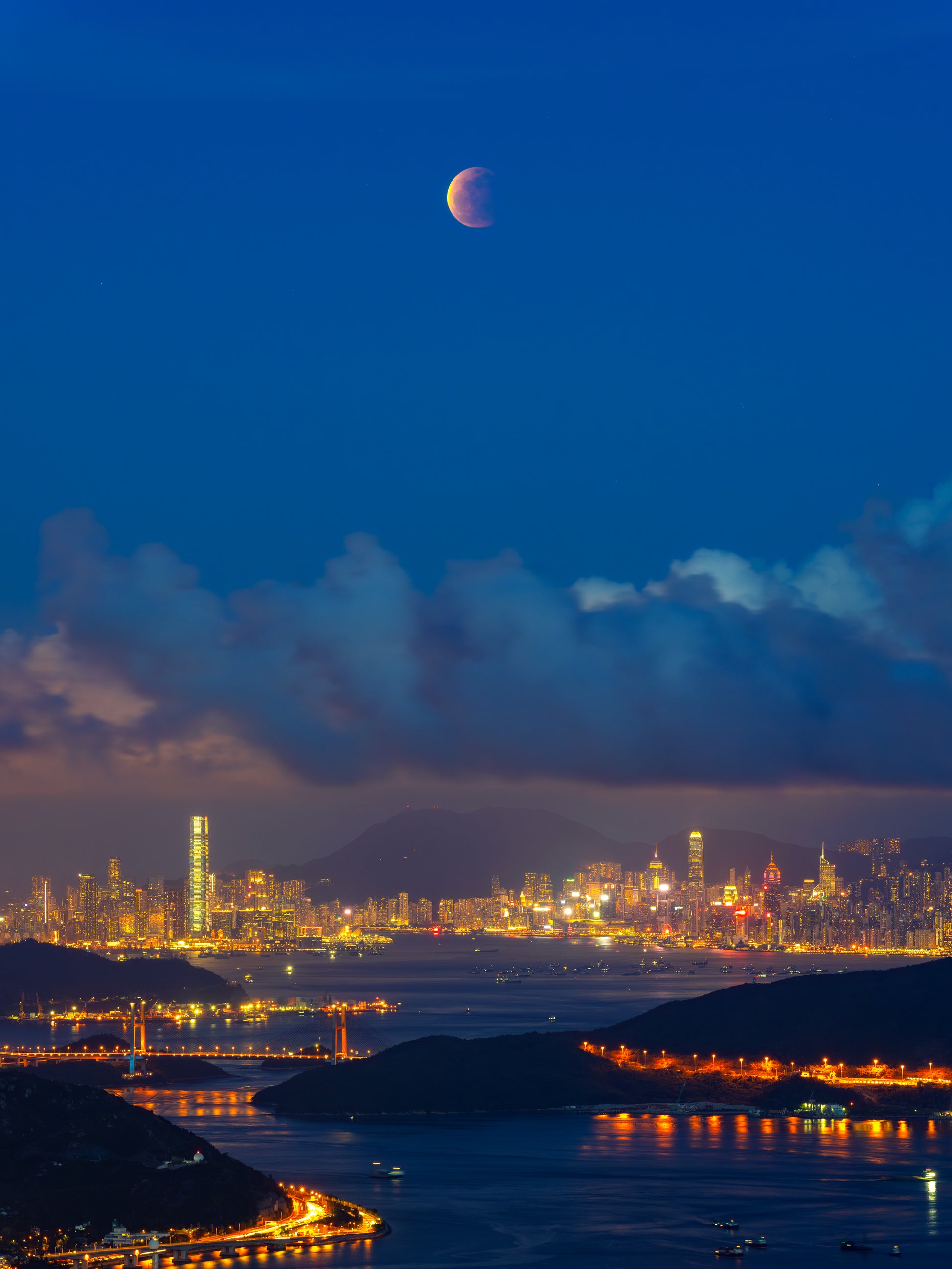 Eclipsed Twilight - As twilight settled across Hong Kong, the city lights rose into the cloud, casting a muted glow through the night. Above, the moon in total eclipse lingered in amber, echoing the light of the city below.