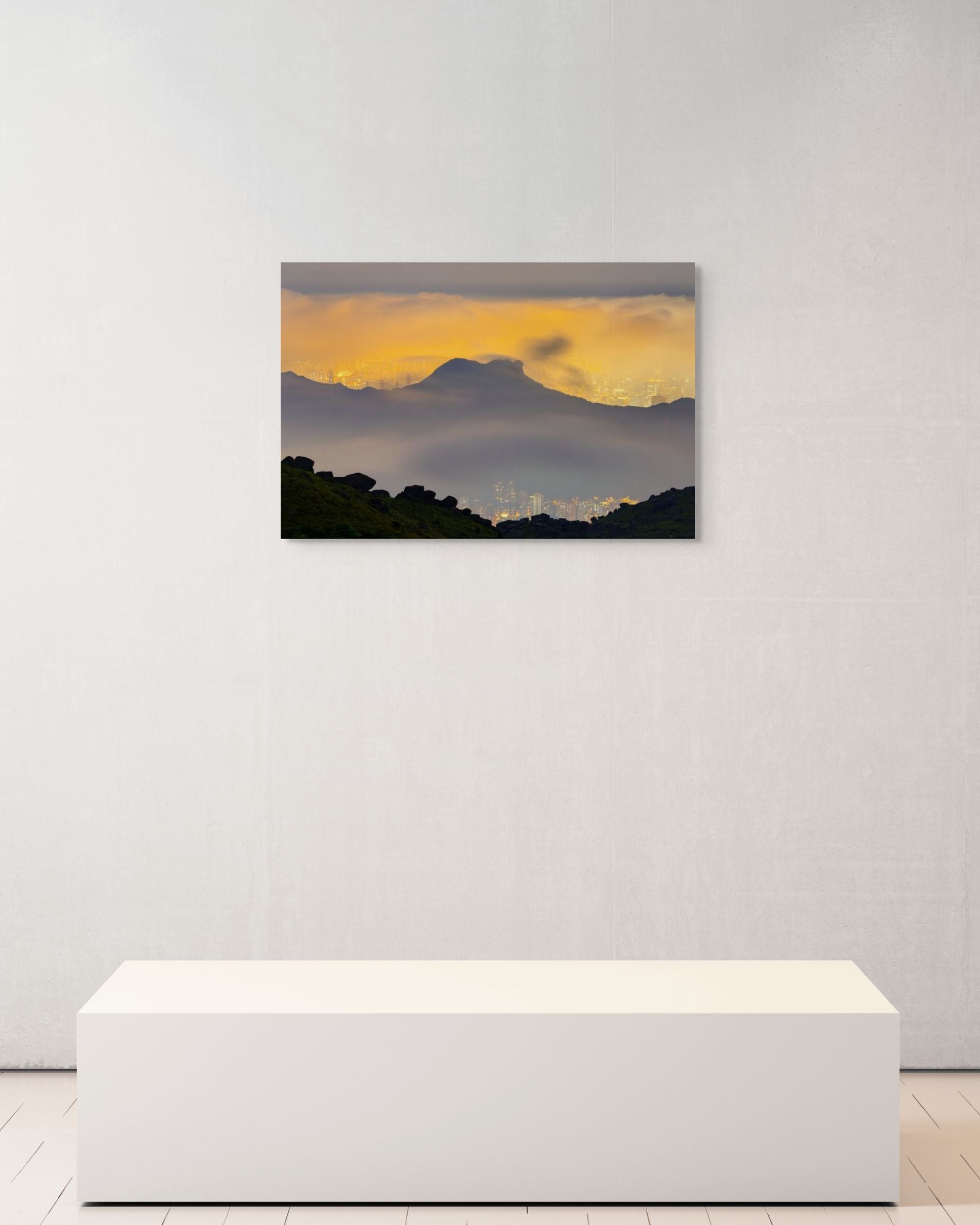 Lion in the Veil - Lion Rock emerges through a thin veil of cloud, its form outlined by the city’s amber glow rising from below. The mist carries the light across the slopes, while the mountain holds its place between two sides of Hong Kong.