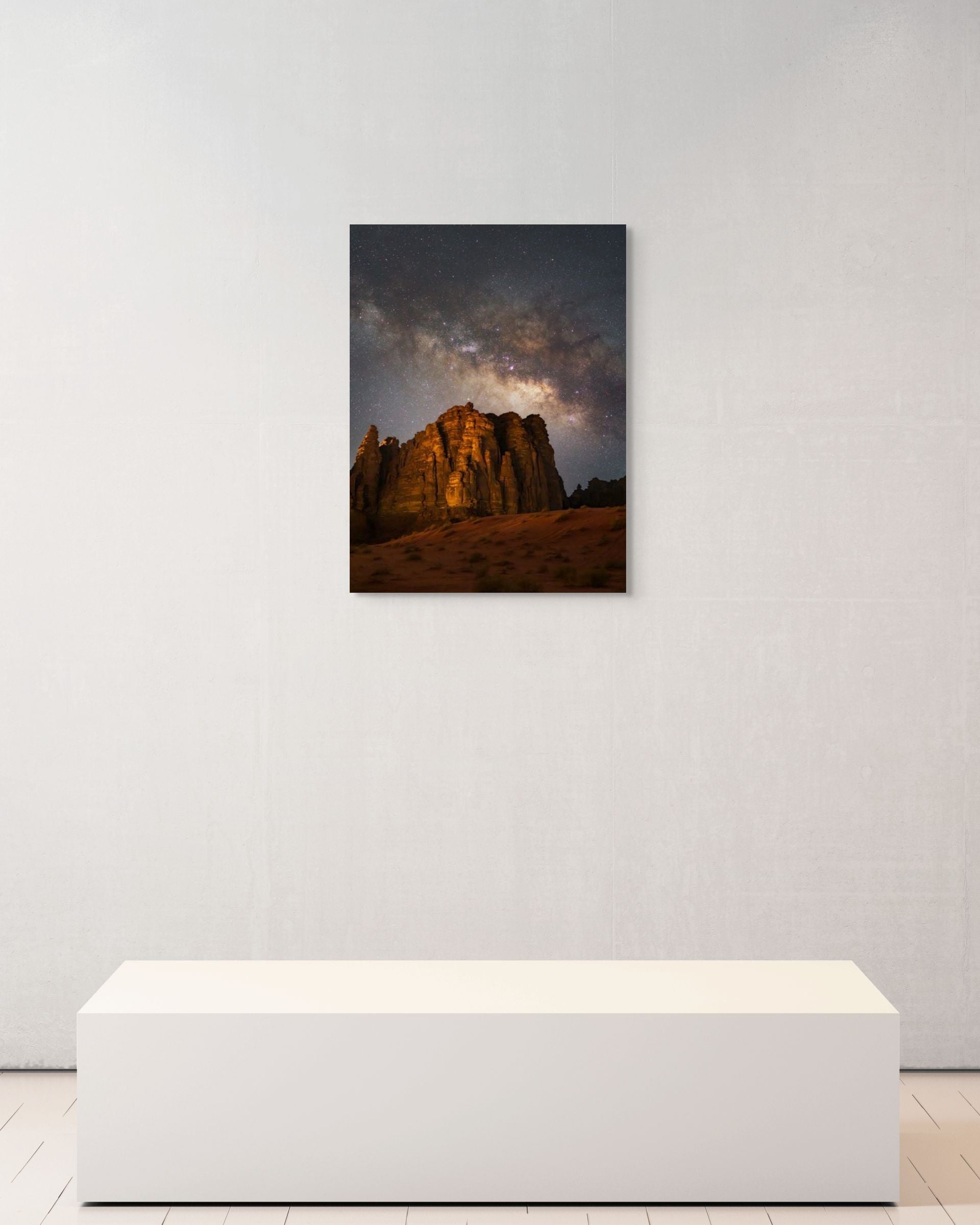Pillar of Eternity – Beneath the stars at the desert’s edge, a towering red sandstone pillar rises into the silence, crowned by the glowing heart of the Milky Way.