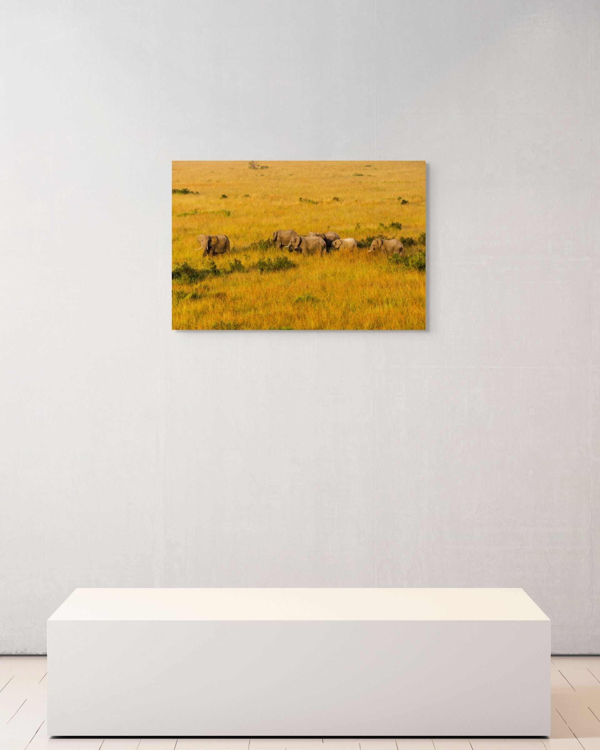 Morning Crossing - In the Maasai Mara, a herd of elephants follows the matriarch across the plain, the calf kept safely in the middle. Their steps carry them through the grassland in the first light of day, a quiet rhythm of care and movement.